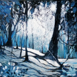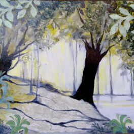 Eastern philosophies inspire a sense of a calm, contemplative atmosphere – this influences my sense of composition, balance and mood. The words ‘stillness, reflection and introspection’ are key qualities in these paintings. My interest in Japan began in Edinburgh College of Art when I undertook a study of Japanese ceramics. This led to a wider interest in Japanese visual imagery. Particularly the compositional devices using flattened perspective, semi-abstract spaces, imaginary settings and fantasy gardens.