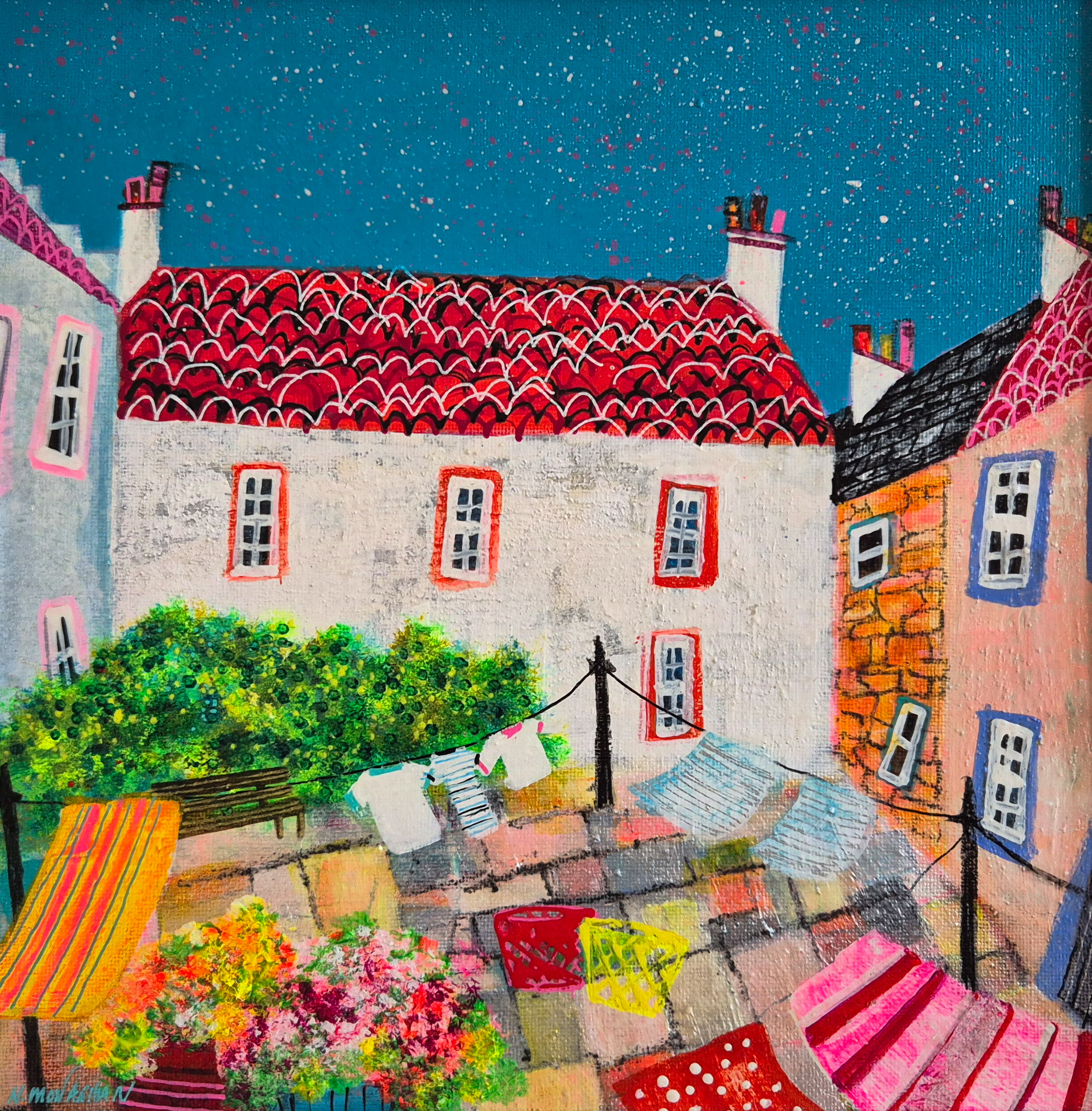 Nikki paints using a mix of acrylics, oil pastels and collage. Landscapes and seascapes are her main subject matter, creating memories of these in a quirky manner, where figures and animals may appear in the work. Inspiration also comes from the everyday...the weather, a colour that catches her eye, a situation. She paints on board and canvas which allows her to layer up mediums creating dense rich colours often discarding my paintbrush and using other means of getting paint onto canvas. Other works from this artist
