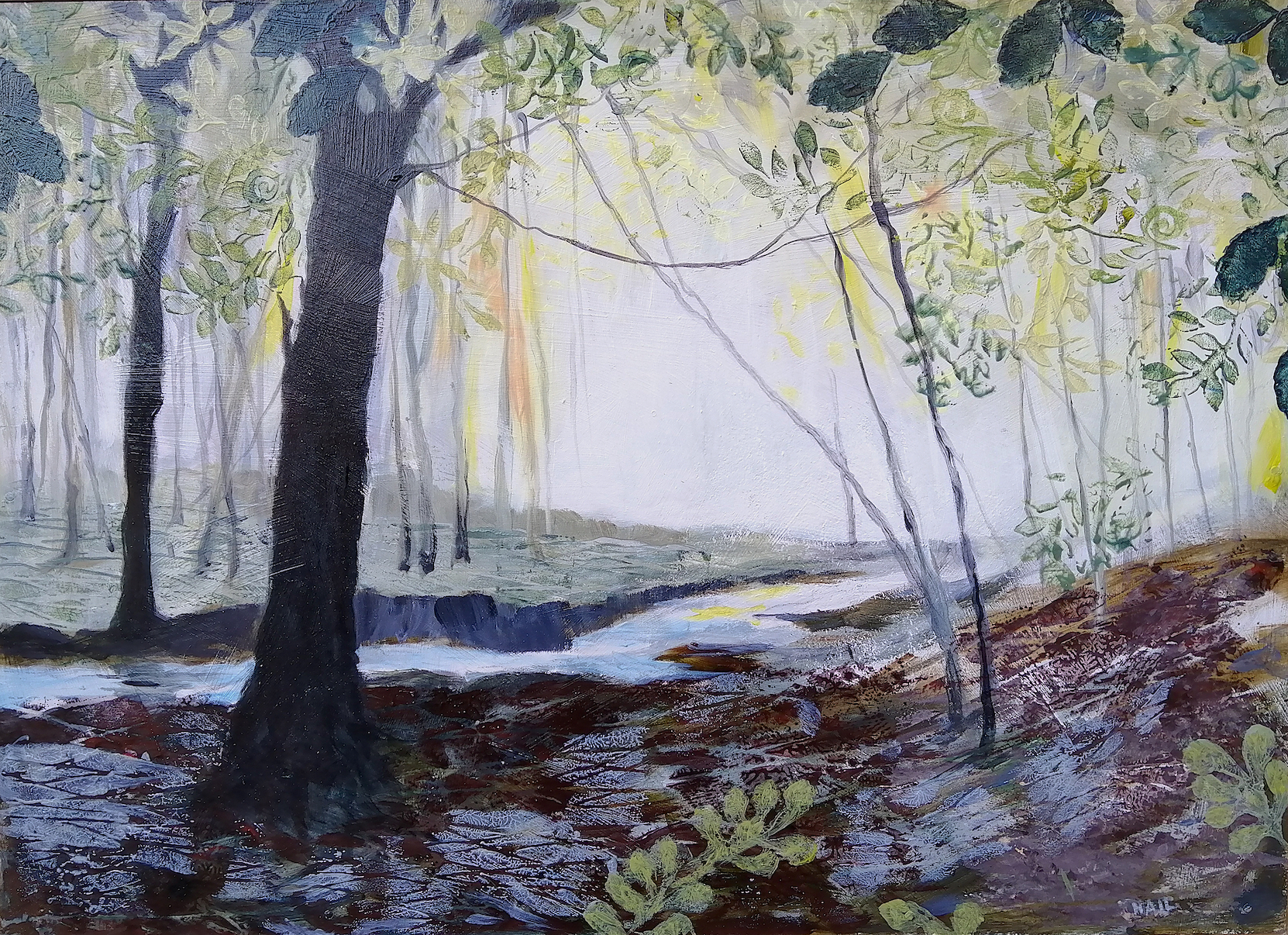 Eastern philosophies inspire a sense of a calm, contemplative atmosphere – this influences my sense of composition, balance and mood. The words 'stillness, reflection and introspection' are key qualities in these paintings. My interest in Japan began in Edinburgh College of Art when I undertook a study of Japanese ceramics. This led to a wider interest in Japanese visual imagery. Particularly the compositional devices using flattened perspective, semi-abstract spaces, imaginary settings and fantasy gardens.
