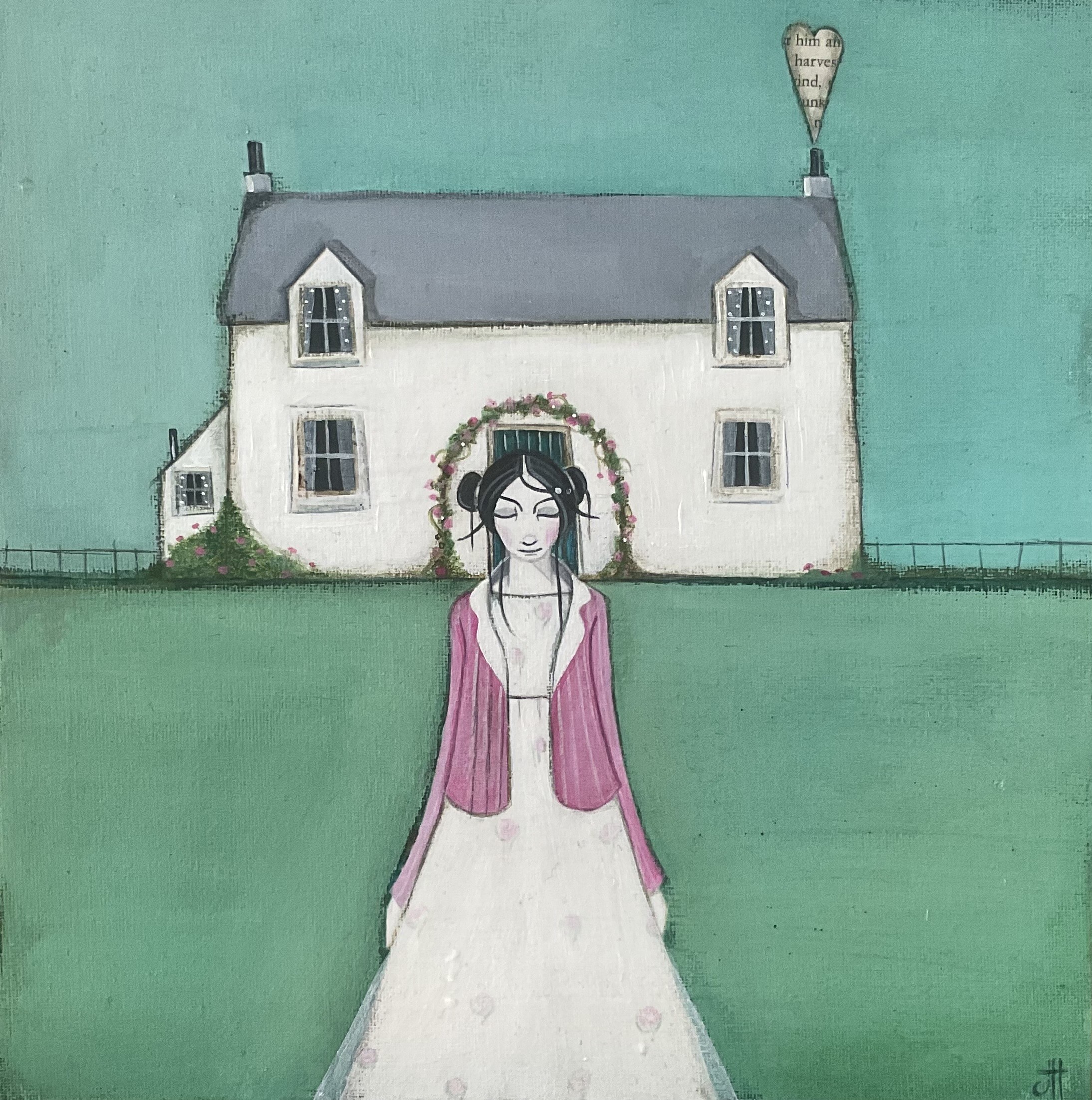 She lived and grew up on the east coast of Scotland and likes to incorporate her experience of rural living and her love of the countryside and the sea in her work. Being given a self-portrait project at university encouraged her to look into different ways of expressing various aspects of herself. Her bird work is very autobiographical, integrating her love of books, poetry and stripy socks. Jackie uses little snippets from her daily life and work, capturing scenes of everyday things that might go unnoticed. Her simplified scenes focus on texture, form, and colour. She likes to surround herself with inspiration, be it flowers, music, or higglety pigglety tea cups.
