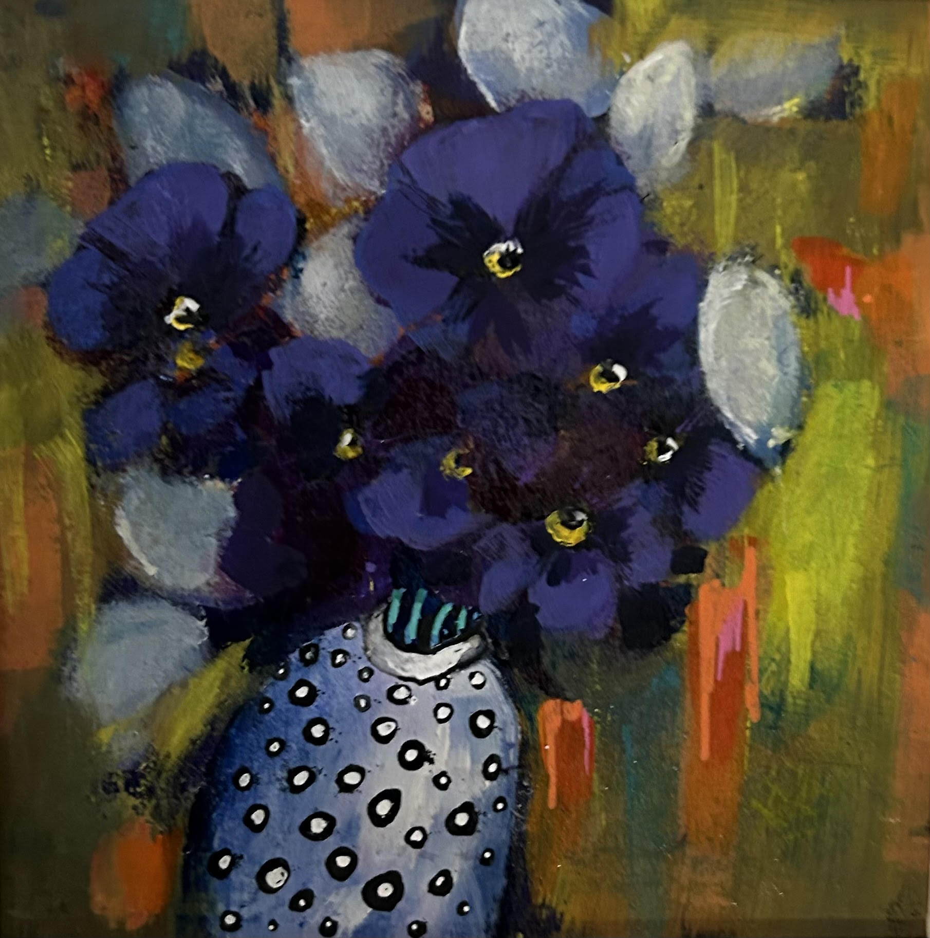 She finds constant inspiration from her surroundings, be it domestic or in nature and enjoys the endless possibilities of balancing colour and shape within her compositions, often using flowers or fruit as poetic accents within the work.