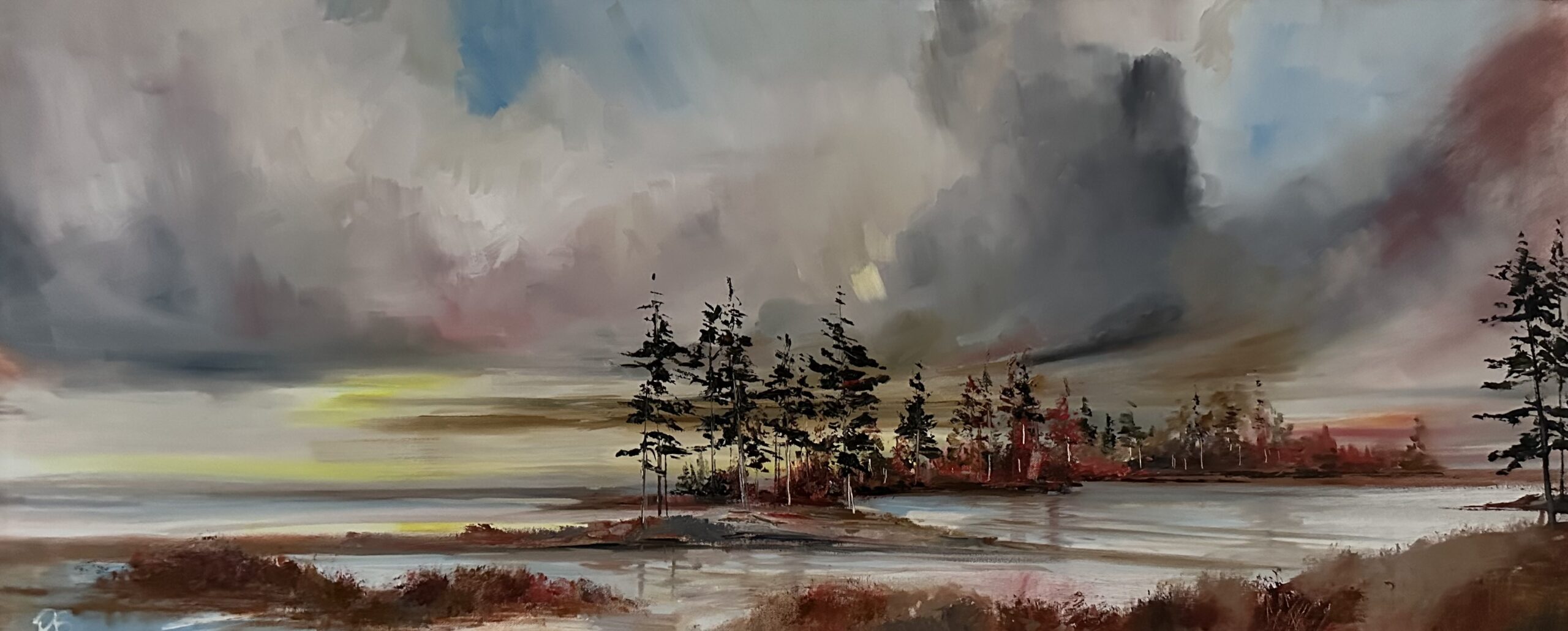 Heightened colours of sunrise, sunset, amidst calm and storm; simplified shape and blending lines are the basis of her distinctive abstract style.