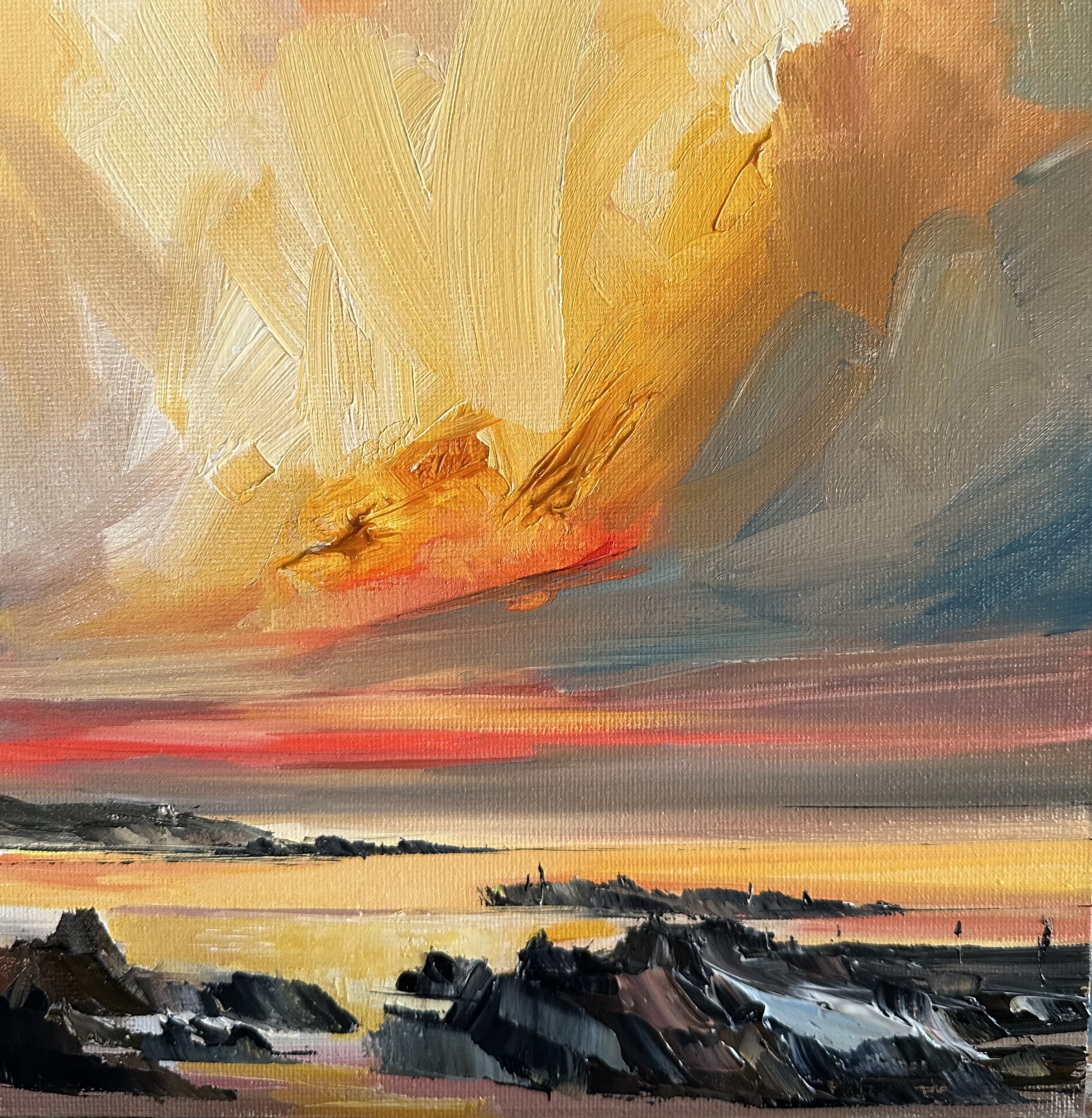 Heightened colours of sunrise, sunset, amidst calm and storm; simplified shape and blending lines are the basis of her distinctive abstract style.