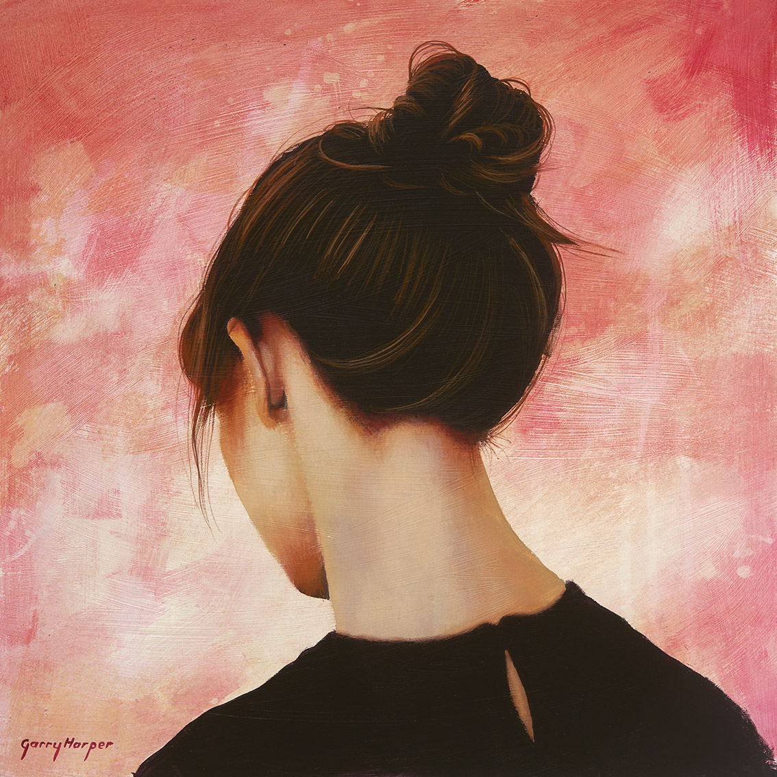 The human figure has always been Garry’s main source of inspiration. He says his creative mind is always at play through the course of a day, taking in ideas for textures, marks and tones to play with and marry them with the human form. Glimpses of people from a film might inspire, or the back of somebody’s head whilst standing in a queue. They become paintings.…as he asks the person he’s come across of they would mind a photo being taken…to be worked up in his studio and turned into one of his studies. He sometimes uses his computer as the canvas too, in the early stages of a work. Using Photoshop, he can experiment with multiple layers, play with composition and colour, and craft an image he can then take to the next stage.