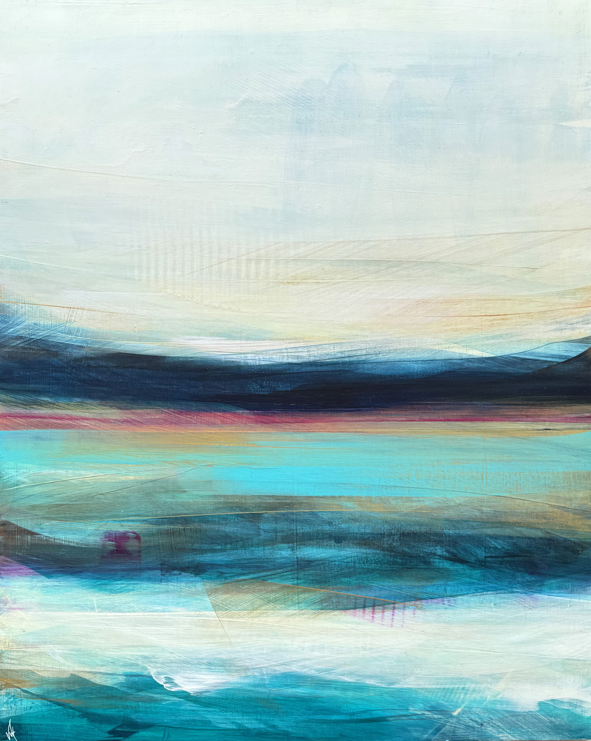 ‘Horizon lines fascinate me. This comes from growing up close to the North Yorkshire Moors – the vast stretches of openness inform my work in many ways. My paintings respond to the changing elements and the rhythm of the landscape as I explore the visual tensions that arise when sky meets sea meets land. My paintings are memories of these moments and while each artwork is a reflection from a particular place, they encompass numerous experiences – each painting lends a fragment of itself to the next.