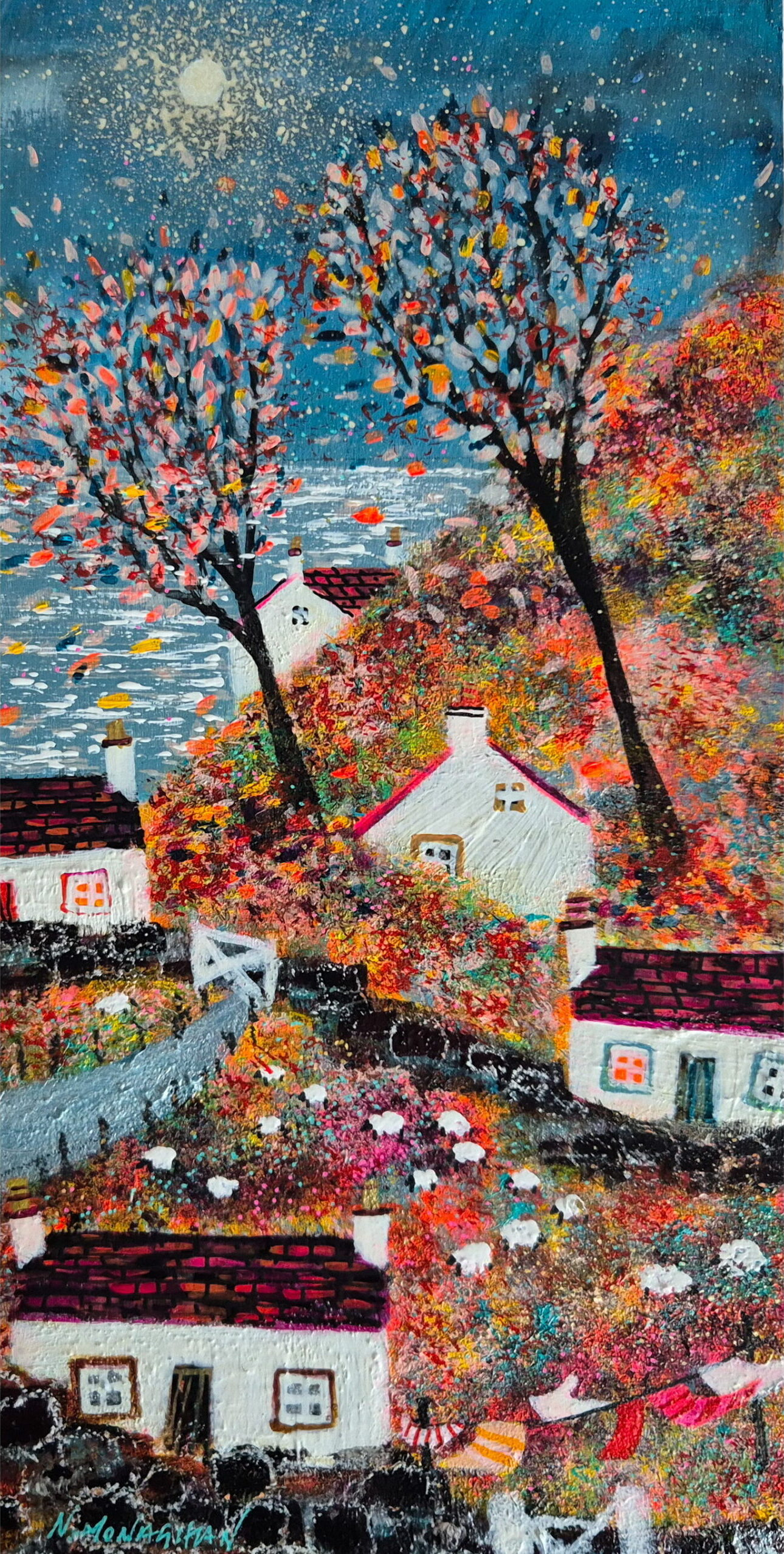 Whitewashed Cottages and Hazy Moon